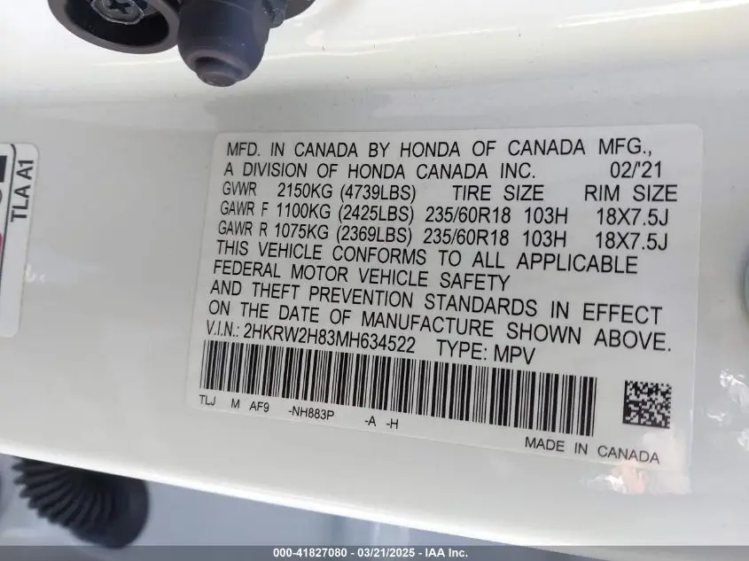 HONDA CR-V 2021 VIN: 2HKRW2H83MH634522 auction history at IAAI USA