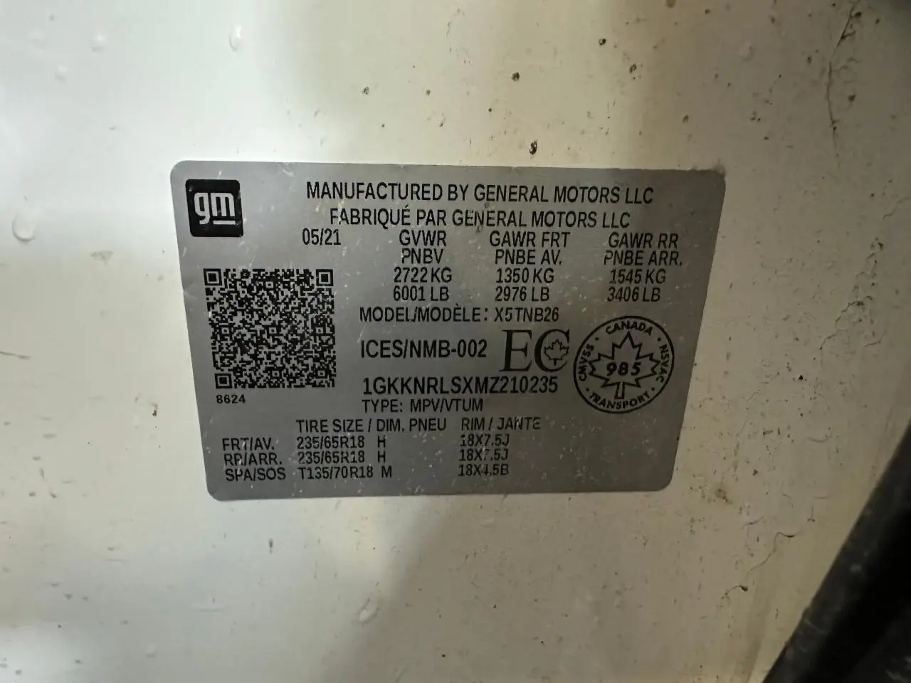 - VIN - 1GKKNRLSXMZ210235